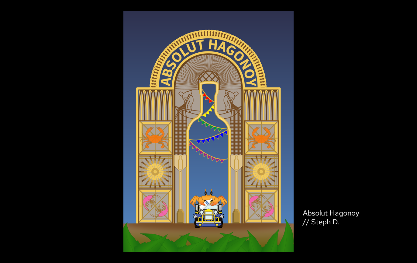 Representing Steph’s hometown of Hagonoy, her take on an Absolut Cities poster puts a spotlight on a characteristic arch. The design features a large Singkaban with elements reflecting Hagonoy’s status as a fishing town. Crabs and shrimp represent some of the most loved seafood in the town. Fishermen and nets subtly pay homage to the fishing industry and its workers. Radiating parades festivities, a crab rides, through the arch and under streamers, on a classic Filipino jeepney holding an Absolut Vodka bottle. Lining the bottom are leaves from the plant of the same name. Absolut Hagonoy celebrates the humble town with bright festivities.