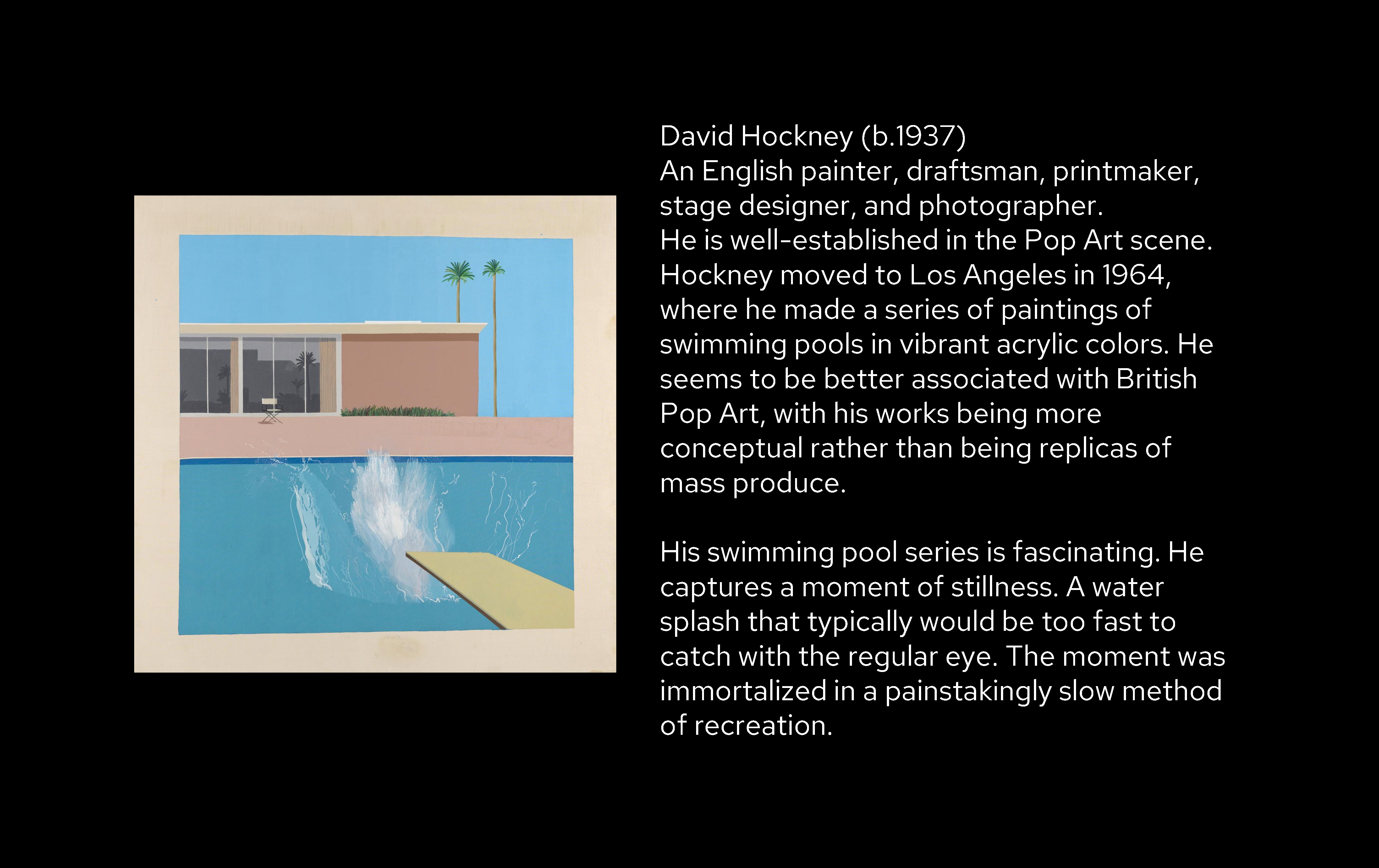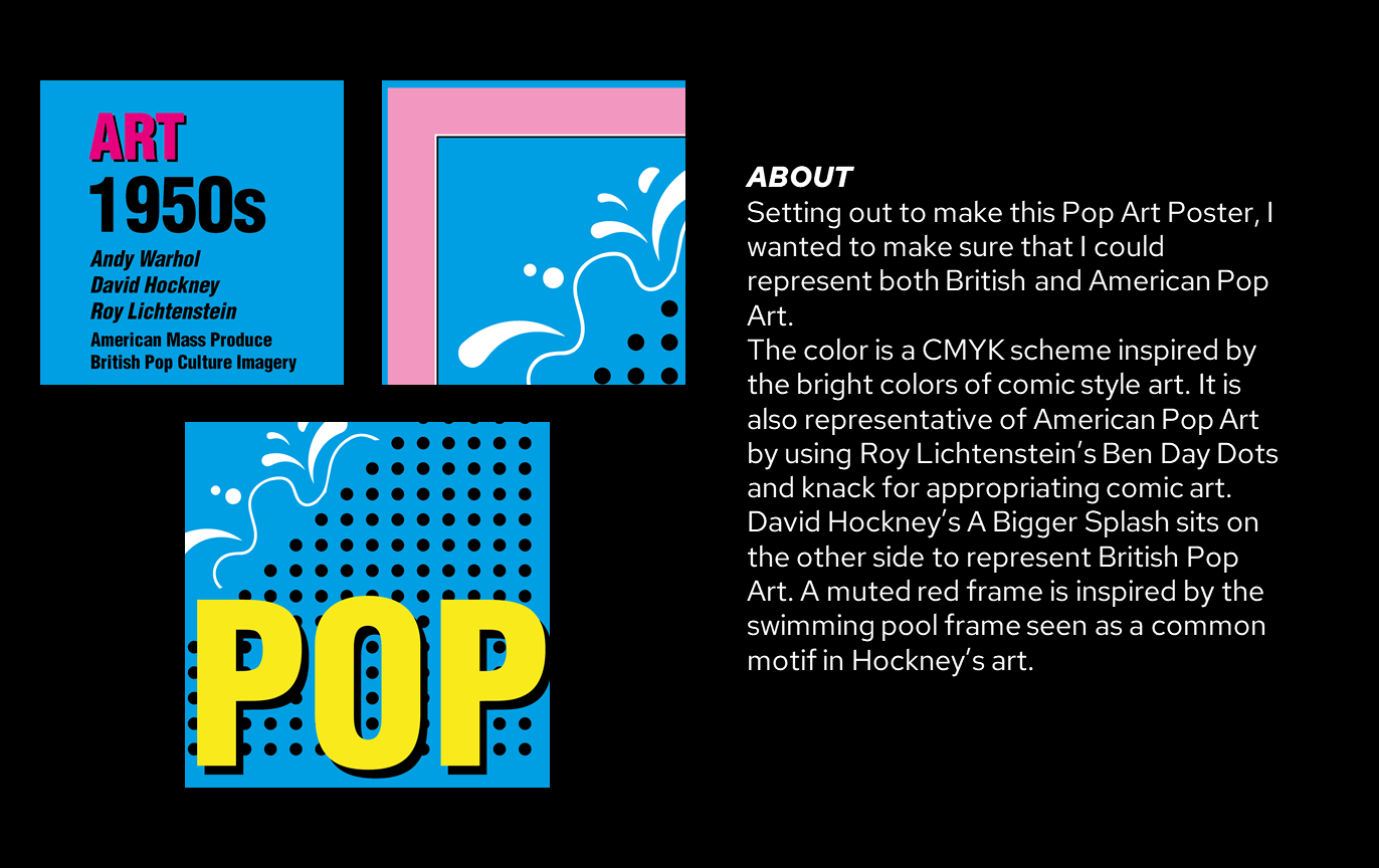 POP showcases two sides of the Pop Art movement. The American side is reflected in Ben Day dots, comic-style water flourishes, and CMYK color scheme. The British side is painted through a swimming pool scene.