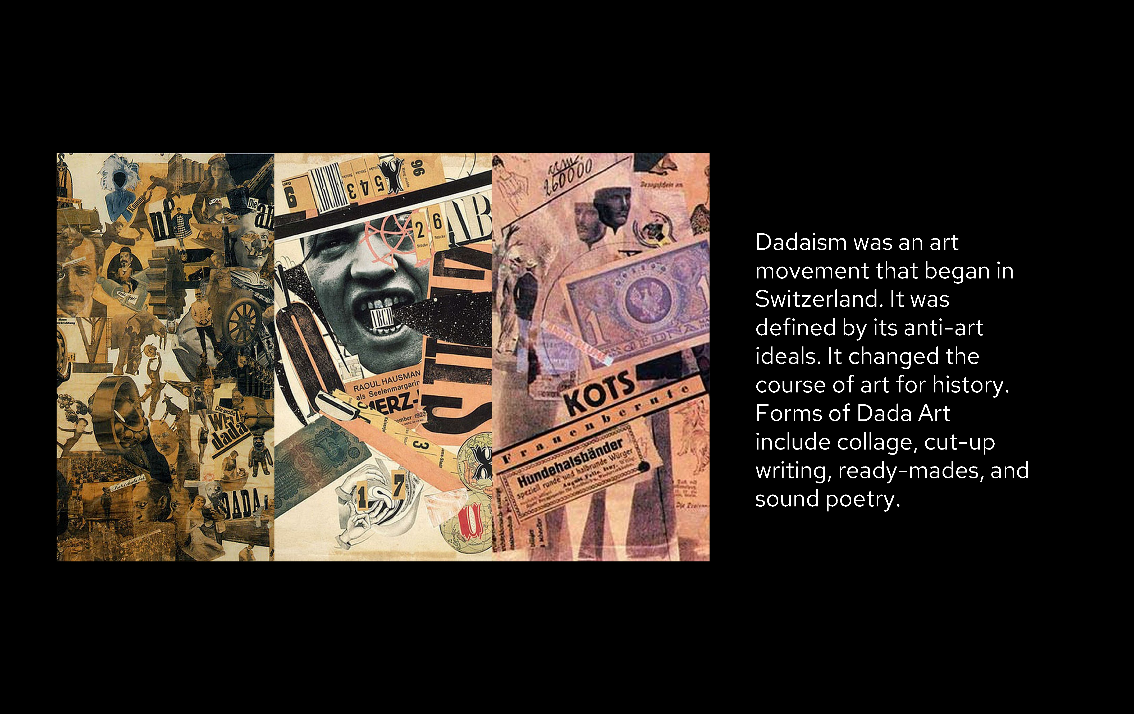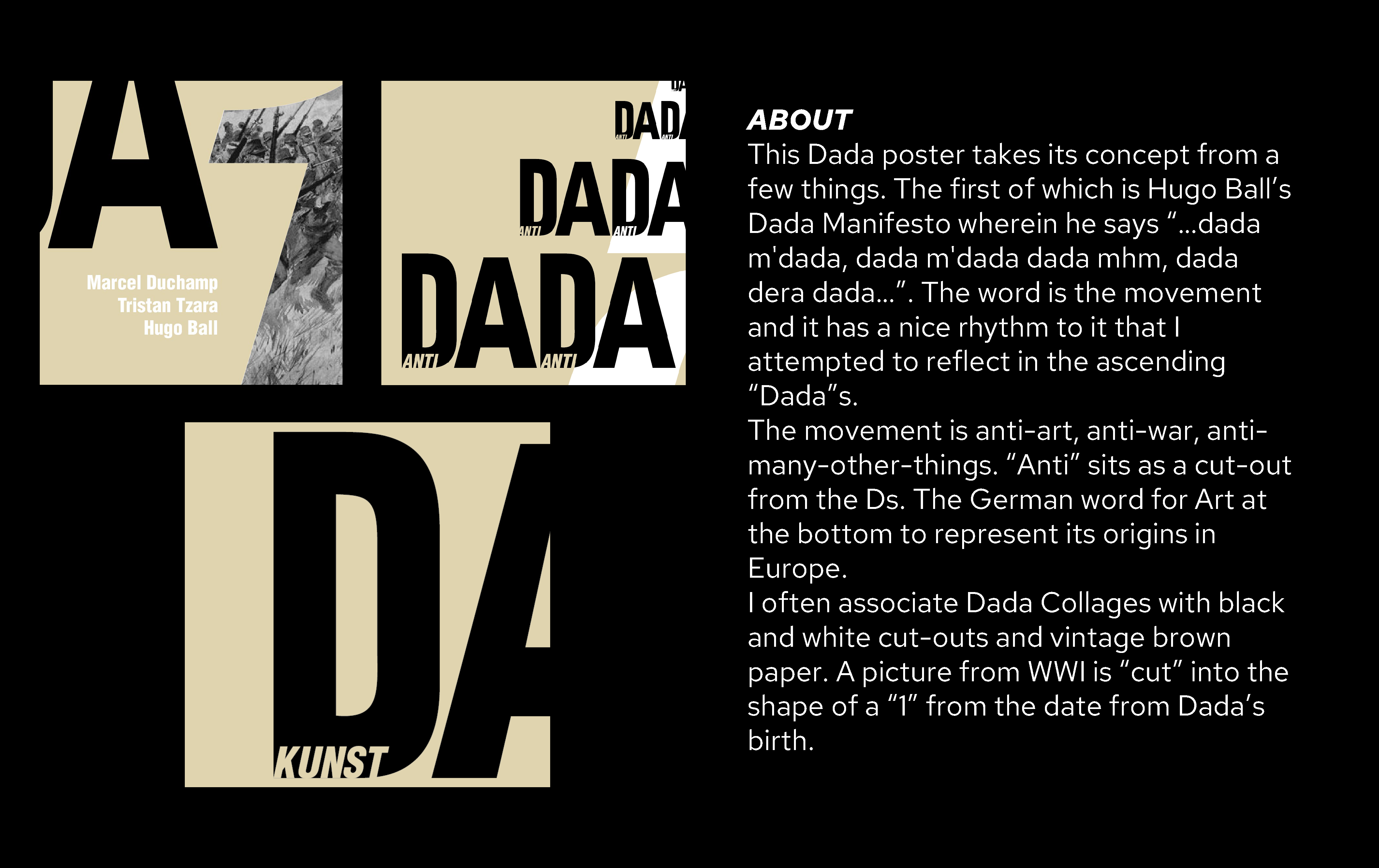 Beginning with Dada Dada, the poster aims to emulate a rhythmic line in Hugo Ball’s Dada Manifesto, the old vintage collage aesthetic, and its anti- philosophies.