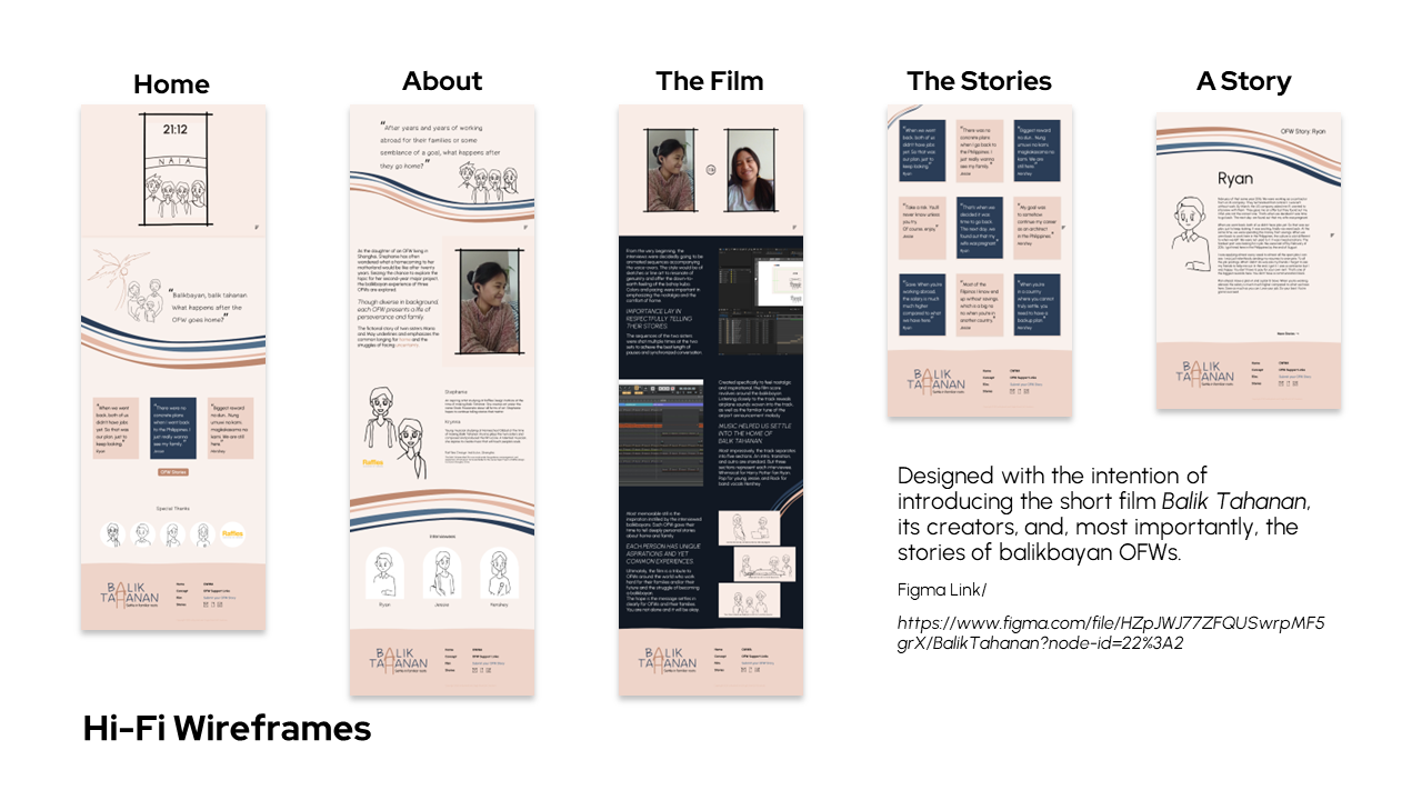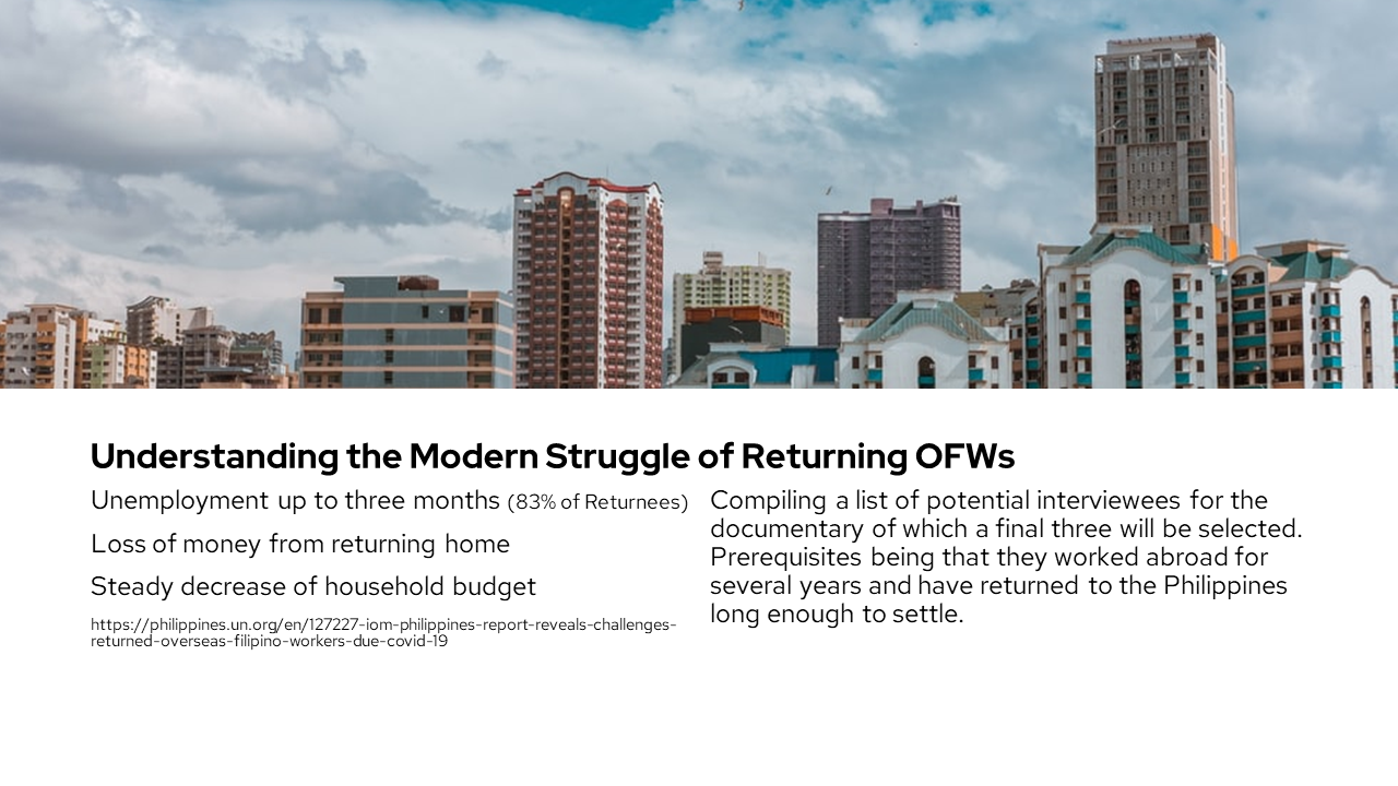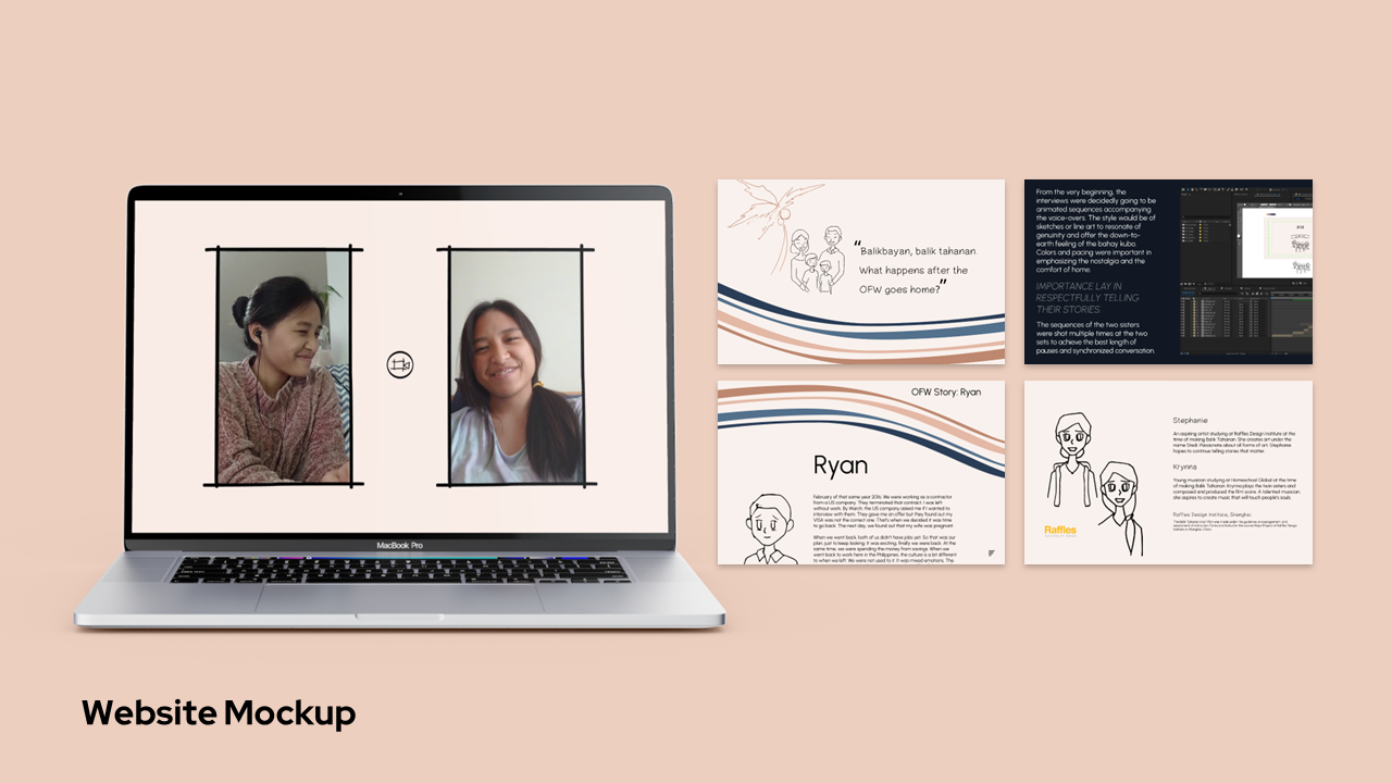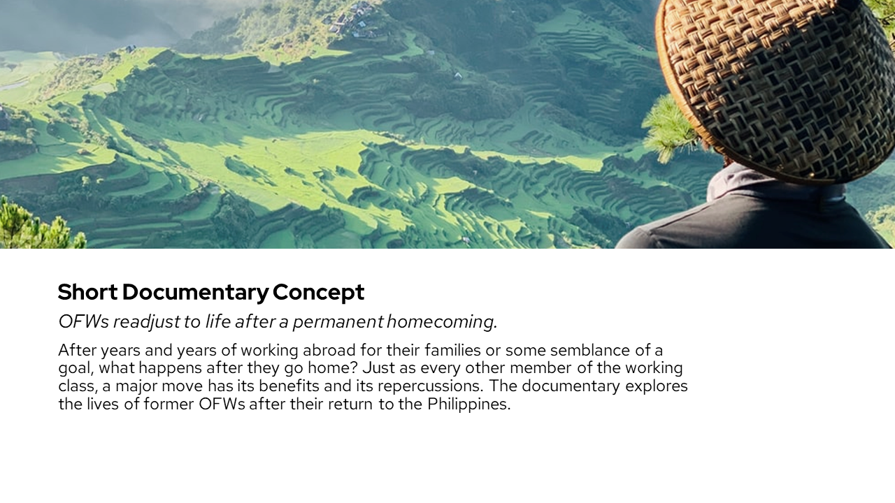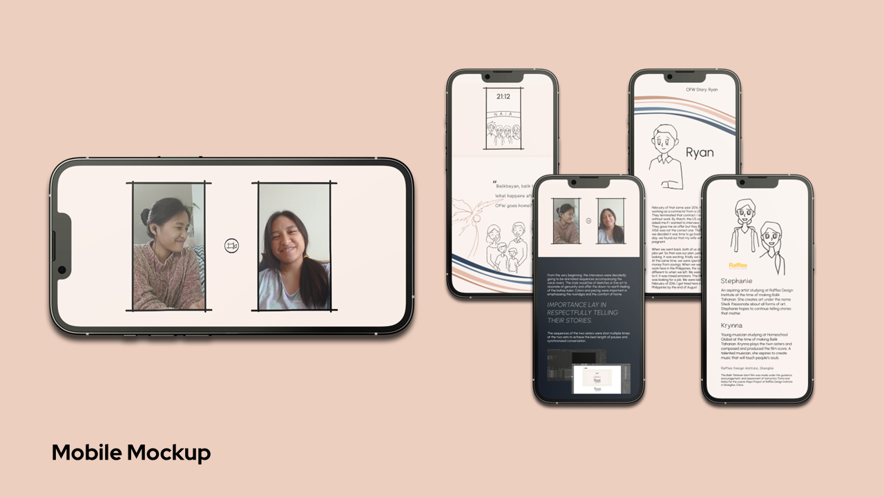 As the daughter of an OFW living in Shanghai, Stephanie has often wondered what a homecoming to her motherland would be like after twenty years. Seizing the chance to explore the topic for her second-year major project, the balikbayan experience of three OFWs are explored. Though diverse in background, each OFW presents a life of perseverance and family. The fictional story of twin sisters Maria and May underlines and emphasizes the common longing for home and the struggles of facing uncertainty.
