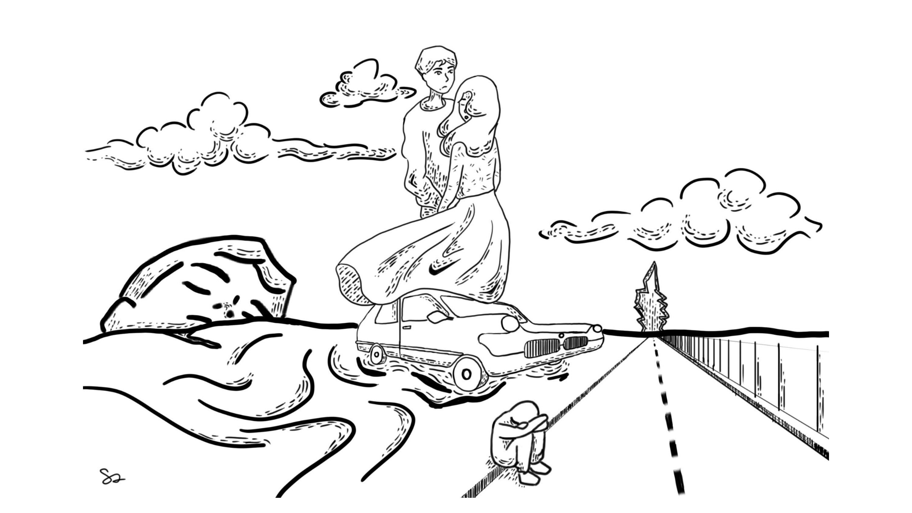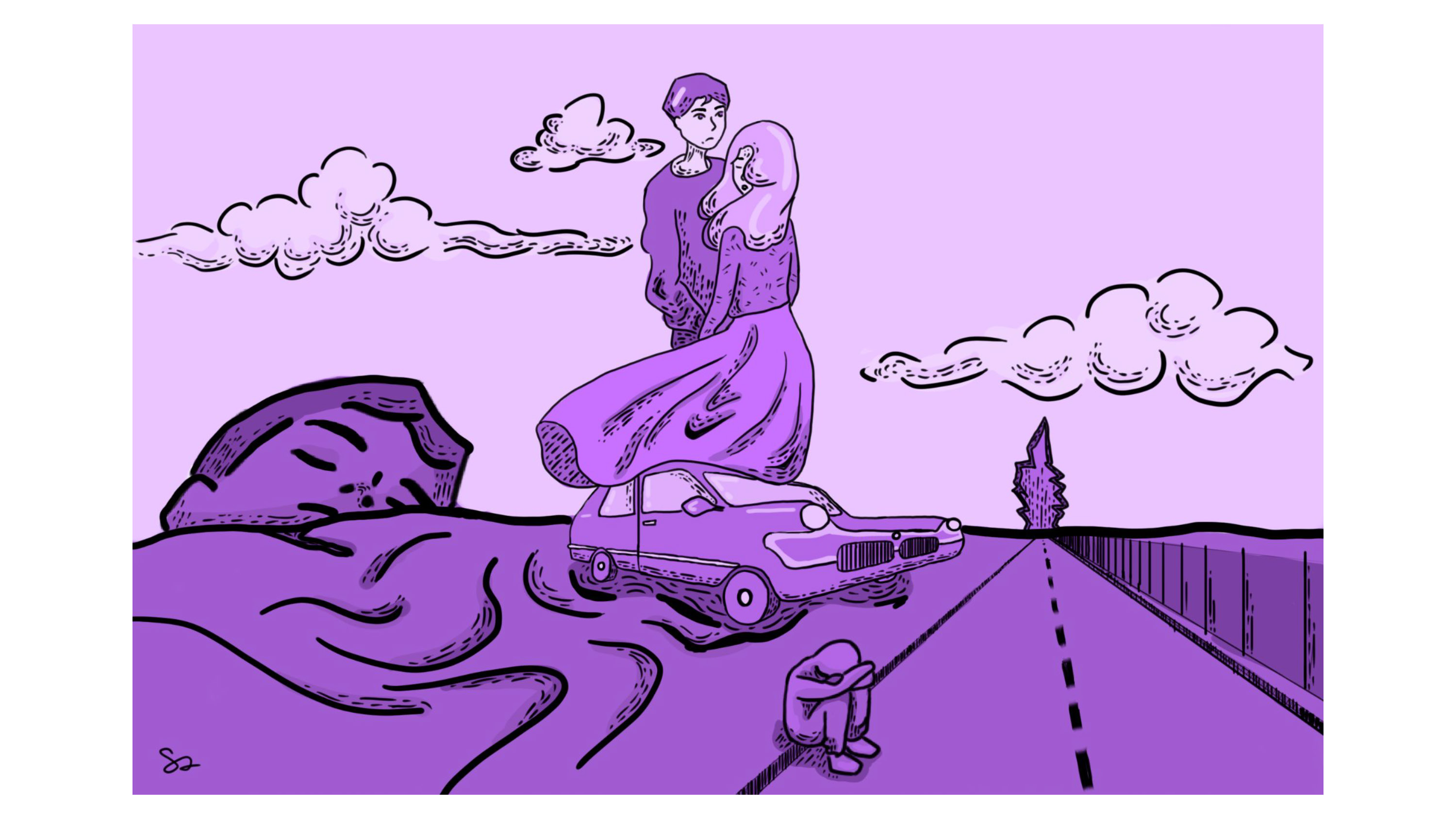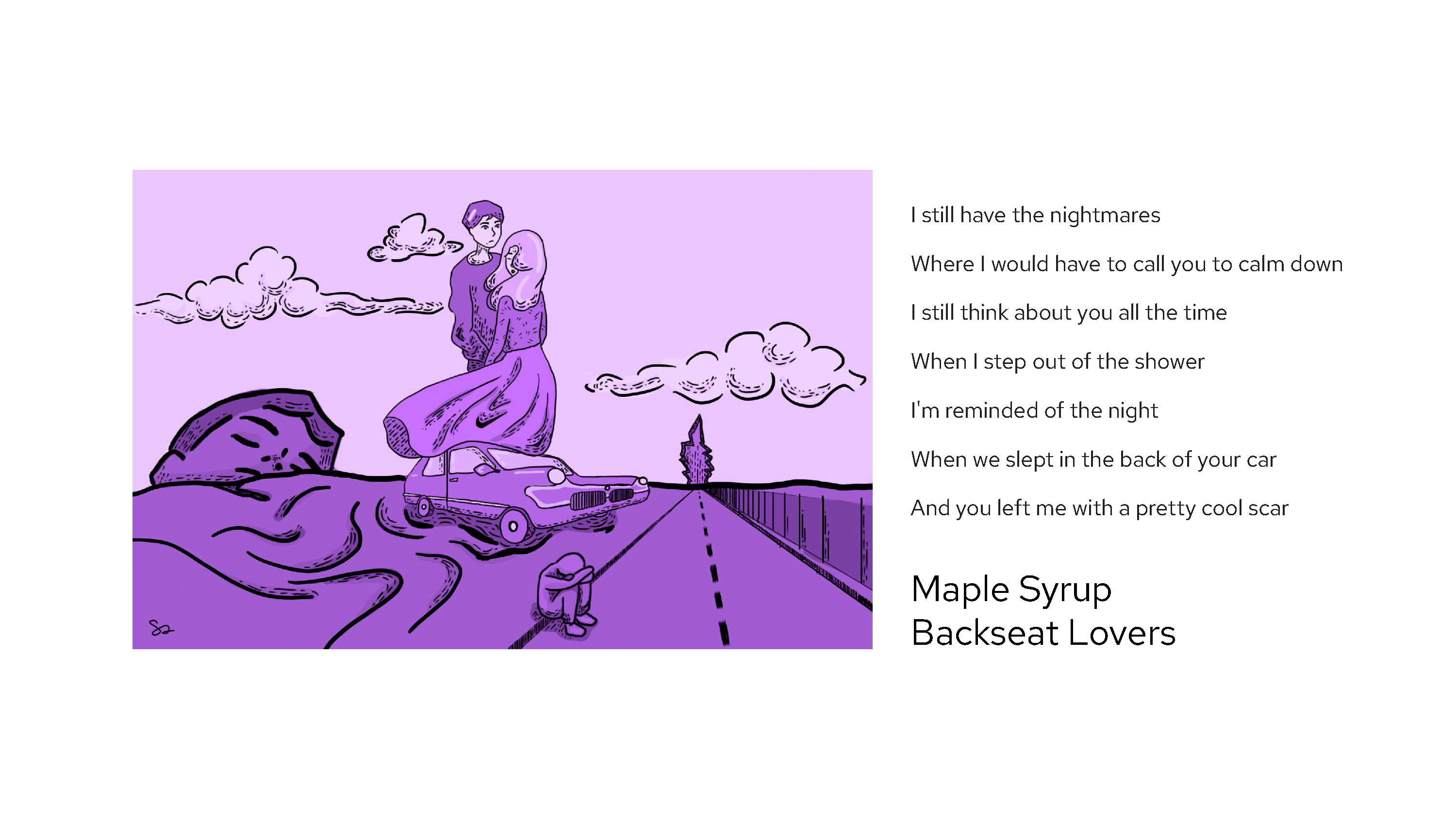 Surrealist illustration based on the song Maple Syrup by the band Backseat Lovers. The illustration is meant to feel like a fever dream, where the dreamscape constantly shifts and you don't quite know what to focus on.