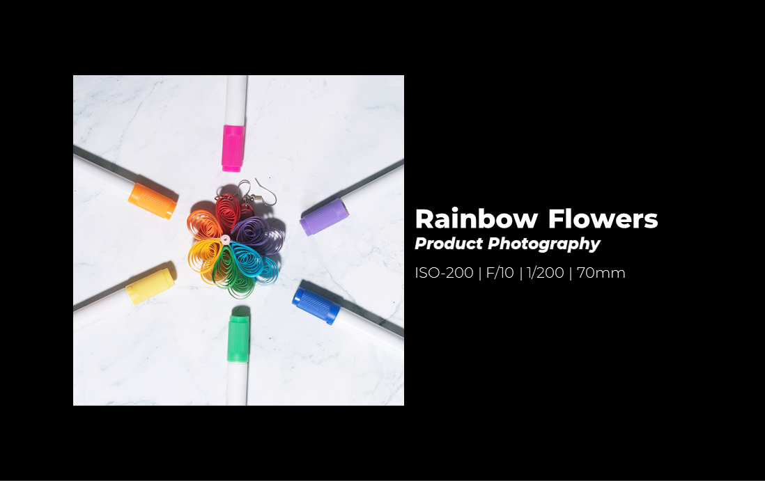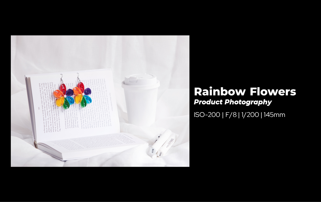 My mom’s handmade quilled earrings. I decided on neutrally colored background and props to make the earrings pop. I found inspiration from photographs of similar earrings for my composition.